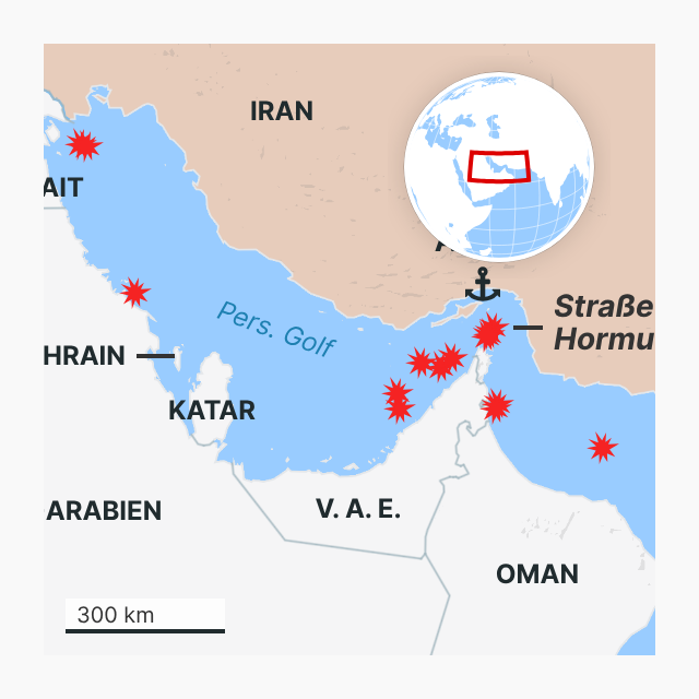 Die Karte verortet die iranischen Angriffe auf zivile Schiffe in der Golfregion seit dem 1. März 2026