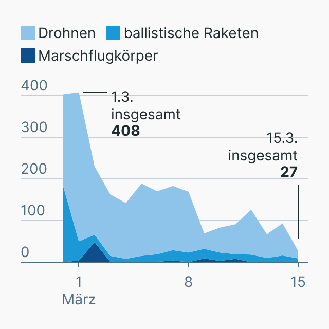 Die Zahl der vom Iran auf Saudi-Arabien, Bahrain und die Vereinigten Arab. Emirate abgefeuerten Flugkörper, ist von 408 am 1. März auf 27 am 15. März zurückgegangen.