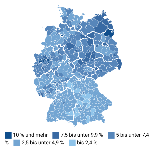 Diese Webgrafiken zeigen den durchschnittlichen Anteil der Arbeitslosen an allen Erwerbspersonen im Jahr 2023 in deutschen Landkreisen, entweder für ganz Deutschland oder in regionalen Zuschnitten.