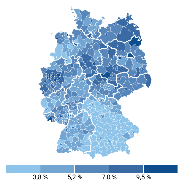 Diese Webgrafiken zeigen die Arbeitslosenquoten für den Monat August 2024 nach Landkreisen, entweder für ganz Deutschland oder nur für einzelne Bundesländer.