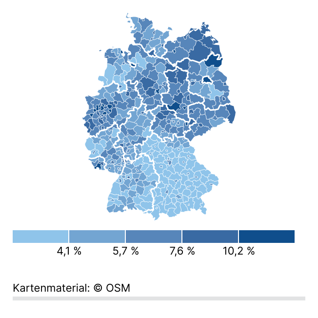 Diese Webgrafiken zeigen die Arbeitslosenquoten für den Monat Juli 2025 nach Landkreisen, entweder für ganz Deutschland oder nur für einzelne Bundesländer.