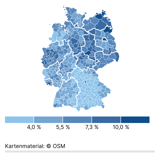 Diese Webgrafiken zeigen die Arbeitslosenquoten für den Monat März 2025 nach Landkreisen, entweder für ganz Deutschland oder nur für einzelne Bundesländer.