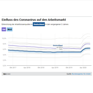 Diese Webgrafik zeigt die Entwicklung der saisonbereinigten Arbeitslosenquoten und den Einfluss der Corona-Krise auf den Arbeitsmarkt in Deutschland in den vergangenen drei Jahren.