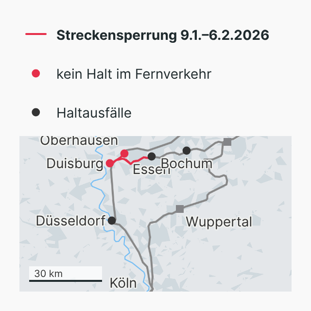 Die Bahnstrecke zwischen Duisburg und Essen, bzw. Oberhausen wird vom 9. Januar bis zum 6. Februar 2026 gesperrt.