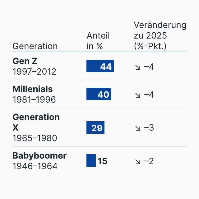 Die Grafik zeigt das Ergebnis einer Umfrage, in der die Bereitschaft zum Jobwechsel abgefragt wurde – aufgeteilt nach verschiedenen Generationen.