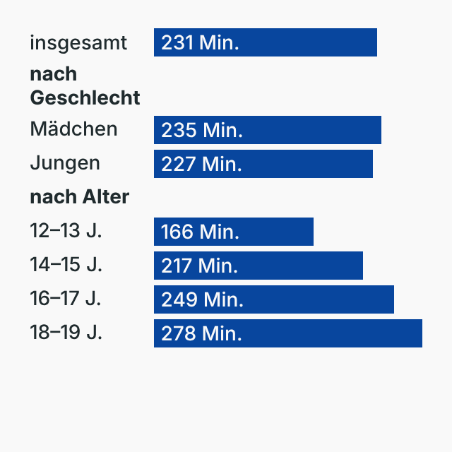 Die Grafik zeigt die durchschnittliche Bildschirmzeit von Jugendlichen in Deutschland, aufgeteilt nach Geschlecht und Altersgruppen