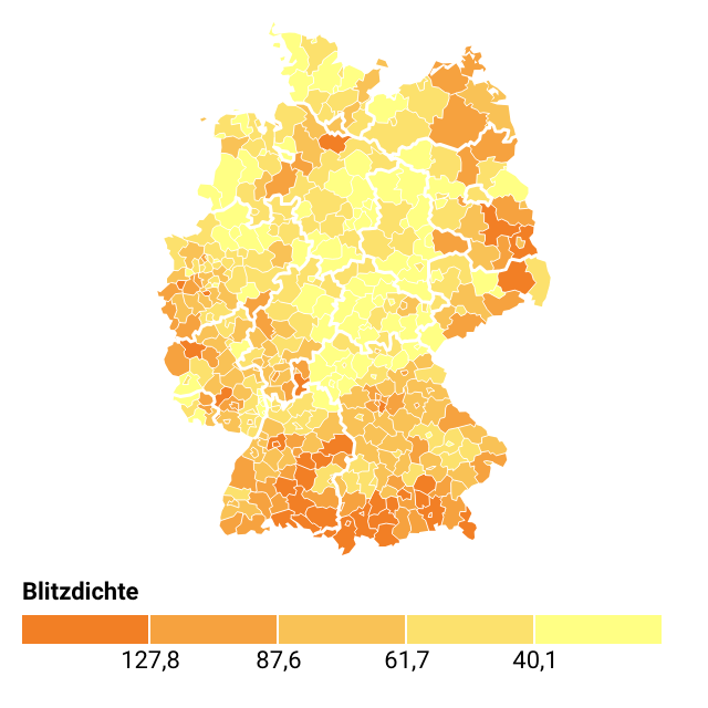 Diese Webgrafiken zeigen die Zahl der Blitzeinschläge in deutschen Landkreisen im Jahr 2022, entweder für ganz Deutschland oder in regionalen Zuschnitten.