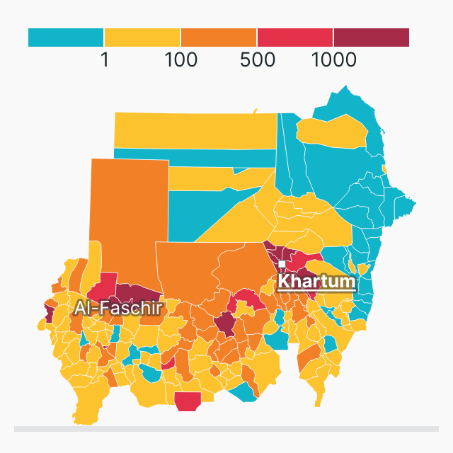 Karte mit Daten zu den durch politische Gewalt Verstorbenen in den einzelnen Distrikten Sudans