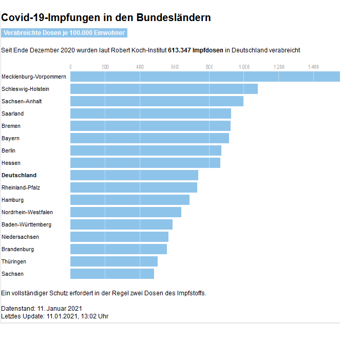 Die Grafik zeigt die Zahl der verabreichten Impfdosen umgerechnet auf die Gesamtbevölkerung und damit den Fortschritt der Impfkampagnen in den Bundesländern. Einmal eingebunden, aktualisiert sich die Grafik täglich.