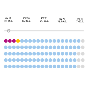 Die Corona-Inzidenzen sinken weiterhin, gleichzeitig nimmt die Anzahl der an der Delta-Variante des Virus erkrankten stetig zu. Diese Grafik zeigt die Entwicklung im Zeitraum KW 19 bis 22.