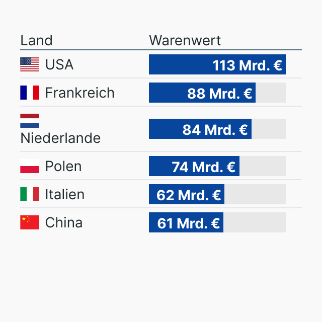Die Grafik zeigt die wichtigsten Export-Länder Deutschlands im Jahr 2025 und in der Desktop-Variante zusätzlich den Vergleich zum Vorjahreszeitraum.