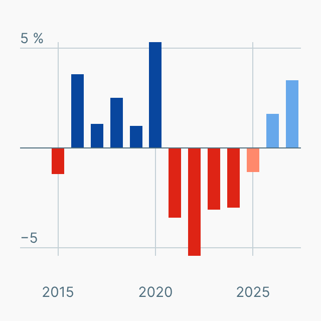 Die Grafik zeigt die Entwicklung des Bauvolumens in Deutschland seit 2015 als prozentuale Veränderung im Vergleich zum jeweiligen Vorjahr
