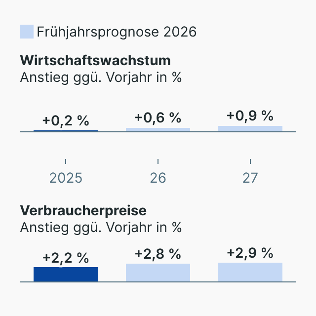 Die Grafik zeigt Eckdaten der Gemeinschaftsdiagnose der führenden Wirtschaftsforschungsinstitute im Frühjahr 2026