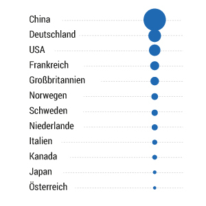 Diese Grafik zeigt die Anzahl neuzugelassener E-Autos und Plug-in-Hybride in ausgewählten Ländern. Die Liste ist sortierbar nach absoluten Werten und Veränderung in Prozent gegenüber dem Vorjahr (Tendenz im jeweiligen Land).