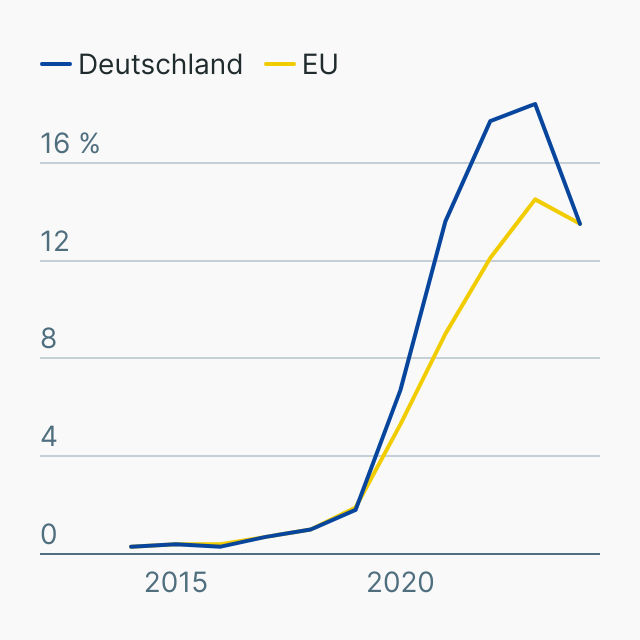 Die Grafik zeigt die Entwicklung des Anteils von Elektroautos an neu zugelassenen Pkw seit 2014, Vergleich zwischen Deutschland und der EU.