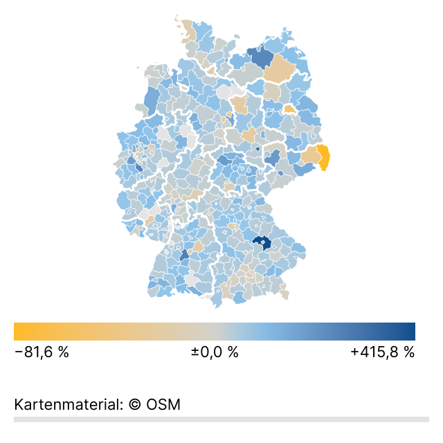 Diese Webgrafiken zeigen die Veränderung der Bauland-Preise in deutschen Kreisen und kreisfreien Städten, entweder für ganz Deutschland oder in regionalen Zuschnitten.