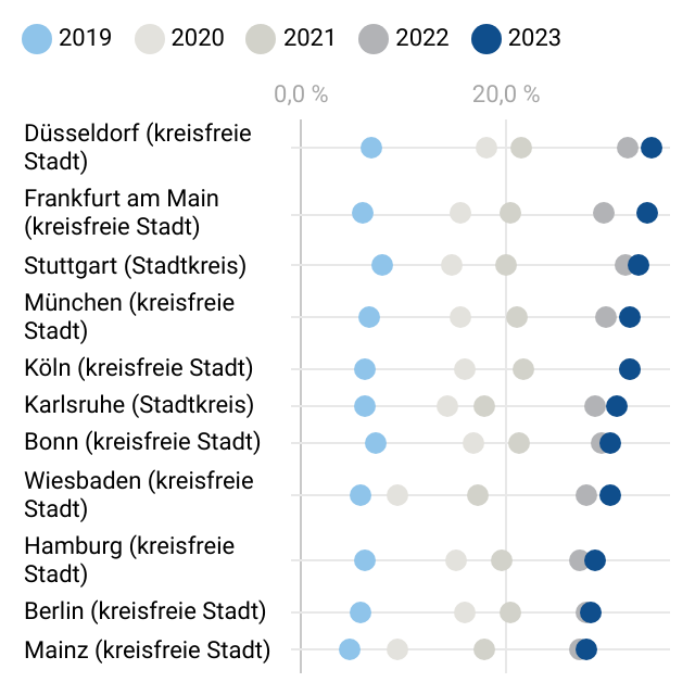 Diese Webgrafiken zeigen den Anteil der Stellenanzeigen mit einer Homeoffice-Möglichkeit in deutschen Kreisen und kreisfreien Städten, entweder für ganz Deutschland oder in regionalen Zuschnitten.