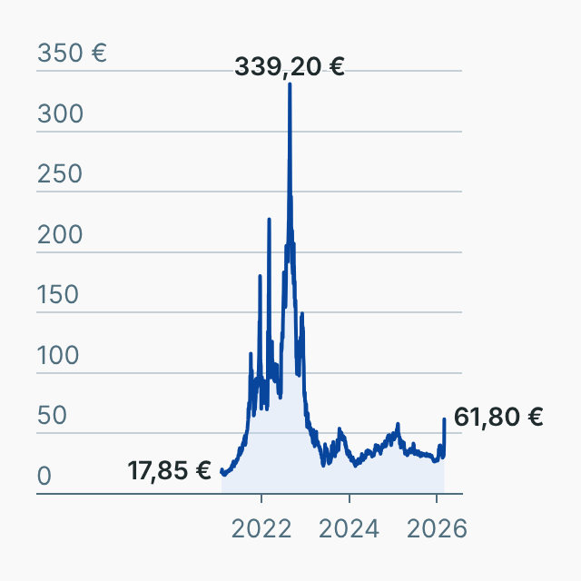 Der Iran-Krieg lässt den Gaspreis aktuell deutlich ansteigen, jedoch noch deutlich unter dem Niveau vom Ausbruch des Ukraine-Krieges.