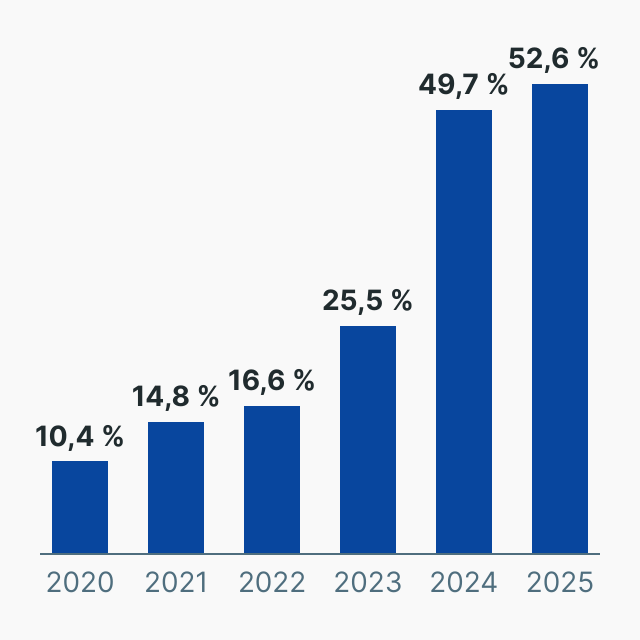 Die Grafik zeigt den Anteil der Autofahrer, die beim Umstieg von einem Verbrenner auf ein E-Auto einen Gebrauchtwagen gewählt haben – Entwicklung seit dem Jahr 2020.