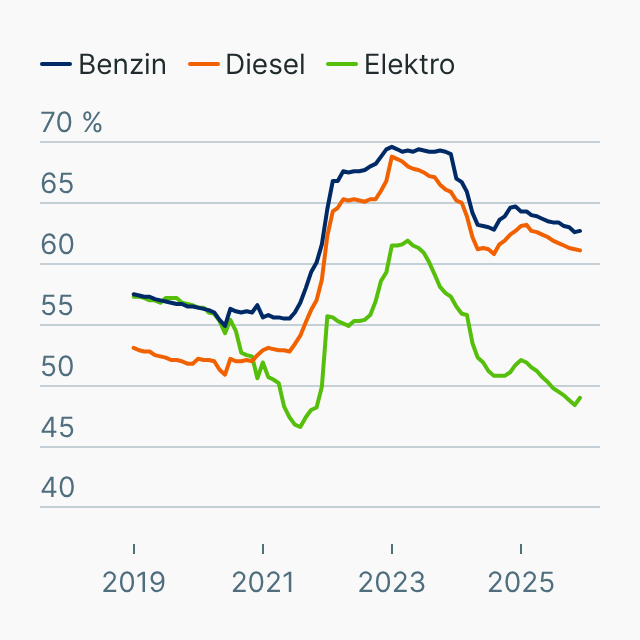 Verglichen mit ihren Neupreisen sind gebrauchte Elektroautos sehr viel günstiger. Für Elektroautos liegt der Restwert (Stand Dezember 2025) bei 49 Prozent. Wer beim Händler einen drei Jahren alten Stromer kauft, zahlt im Schnitt also nicht einmal die Hälfte des Listenneupreises.