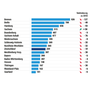Diese Grafik zeigt die Anzahl geklauter Fahrräder je 100 000 Einwohner in 2019 und die Veränderung zu 2018.