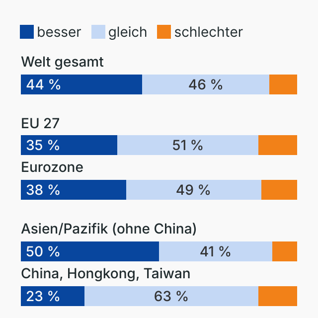 Umfrage aus dem „World Business Outlook“ unter 3500 AHK-Unternehmen (Unternehmen der Außenhandelskammern) weltweit zu deren Einschätzung zu Geschäftserwartungen: Werden diese besser, schlechter oder bleibt das Geschäft gleich?
