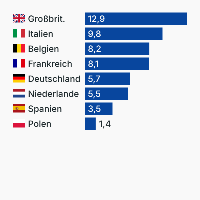 Die Grafik zeigt die europäischen Länder mit den höchsten jährlichen Warenimporten aus den Golfstaaten, die von der Blockade der Straße von Hormus betroffen sind.