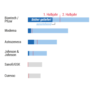 Diese Webgrafik zeigt die Menge der gelieferten und noch ausstehenden Impfdosen der Hersteller Biontech/Pfizer, Moderna, Astrazeneca, Johnson & Johnson, Sanofi/GSK und Curevac – aufgeteilt nach 1. und 2. Halbjahr 2021.