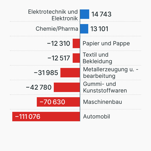Die Grafik zeigt, wie viele Jobs in den verschiedenen Branchen der deutschen Industrie im Vergleich zu 2019 abgebaut wurden.