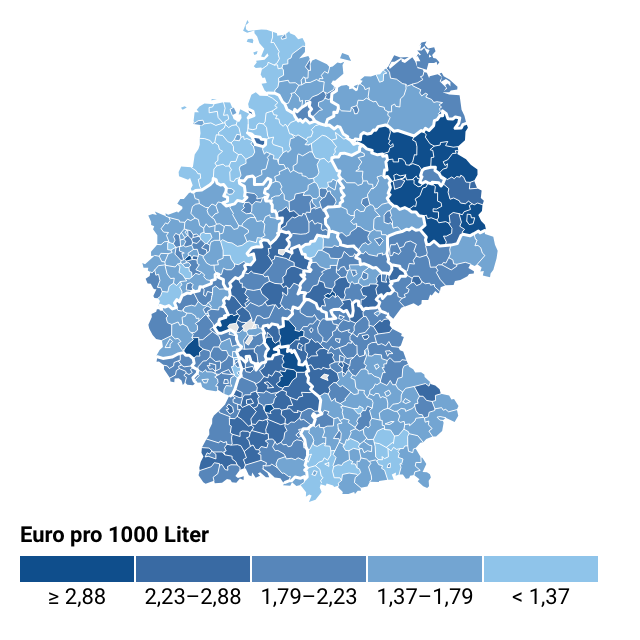 Diese Webgrafiken zeigt die Kosten für Leitungswasser in deutschen Kreisen und Städten, entweder für ganz Deutschland oder in regionalen Zuschnitten.