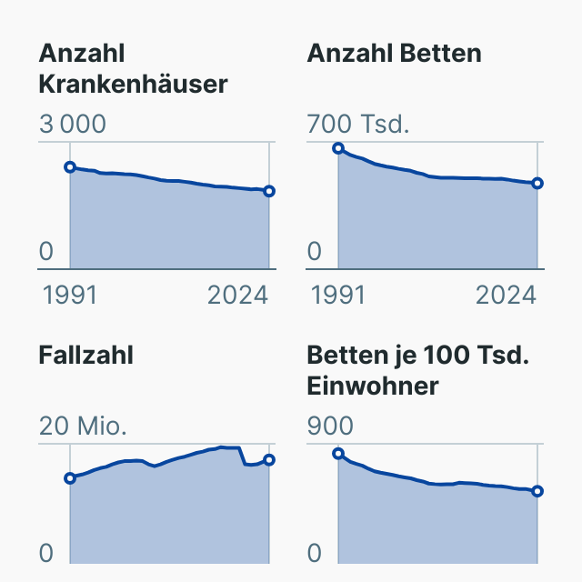 Die Entwicklung der wichtigsten Kennzahlen für die Krankenhäuser in Deutschland von 1991 bis 2024.