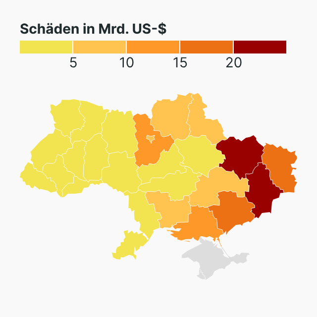 Die Karte zeigt die Höhe der Kriegsschäden nach vier Jahren Krieg in den ukrainischen Regionen.