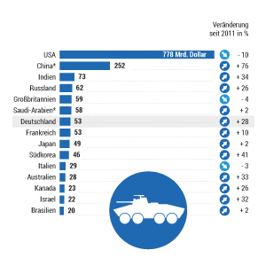 Diese Grafik listet die Länder mit den höchsten Militärausgaben 2020 und bietet die Möglichkeit der Sortierung nach absoluten Ausgaben und prozentualer Veränderung seit 2011.