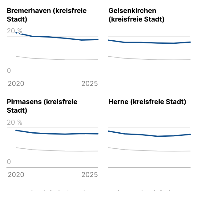Diese Webgrafiken zeigen die Entwicklung des Anteils überschuldeter Bürgerinnen und Bürger an der volljährigen Bevölkerung in deutschen Landkreisen bis zum Jahr 2025, entweder für ganz Deutschland oder in regionalen Zuschnitten.