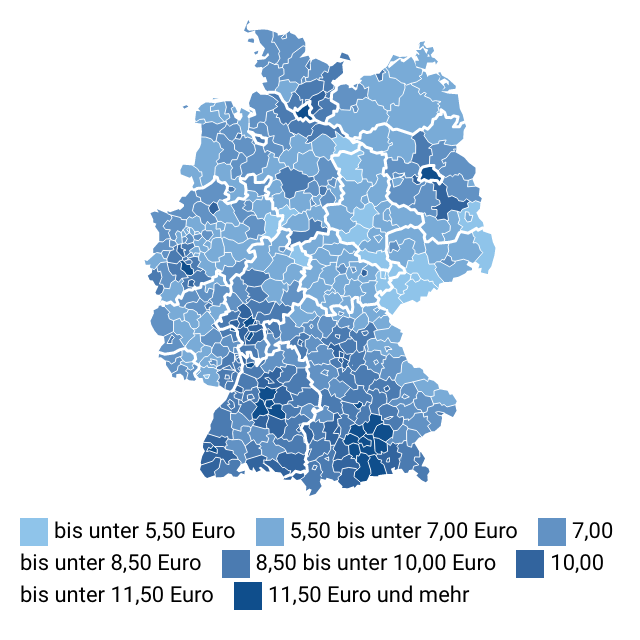 Diese Webgrafiken zeigen die durchschnittlichen Mieten bei inserierten Wohnungen 2021, pro Quadratmeter und nettokalt in deutschen Landkreisen, entweder für ganz Deutschland oder in regionalen Zuschnitten.