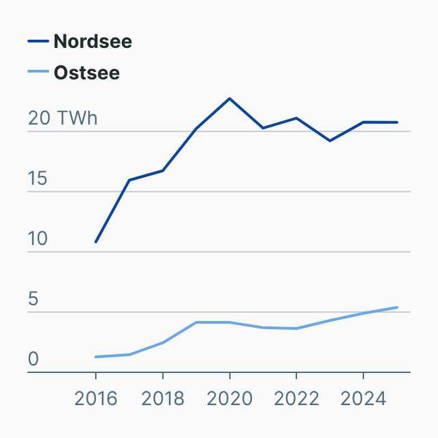 Die für die Energiewende wichtigen Offshore-Windkraftanlagen in der Nordsee haben im vergangenen Jahr rund acht Prozent mehr Strom geliefert als 2023. Insgesamt sind 20,78 Terawattstunden (TWh) Windenergie an Land übertragen worden.