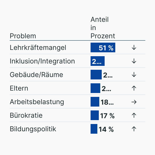 Umfrage unter Schulleiterinnen und Schulleitern: Die meistgenannten Probleme an deutschen Schulen und Veränderung im Vergleich zum Vorjahr.