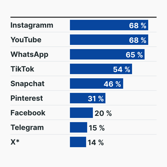 Die Grafik zeigt die unter Jugendlichen am häufigsten genutzten Social-Media-Kanäle