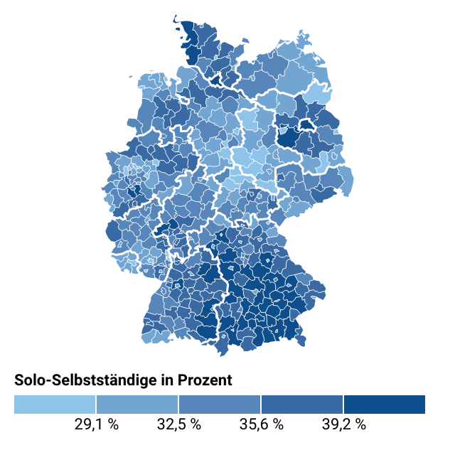 Diese Webgrafiken zeigen den Anteil von Solo-Selbstständigen allen angemeldeten Unternehmen in deutschen Kreisen und kreisfreien Städten, entweder für ganz Deutschland oder in regionalen Zuschnitten.