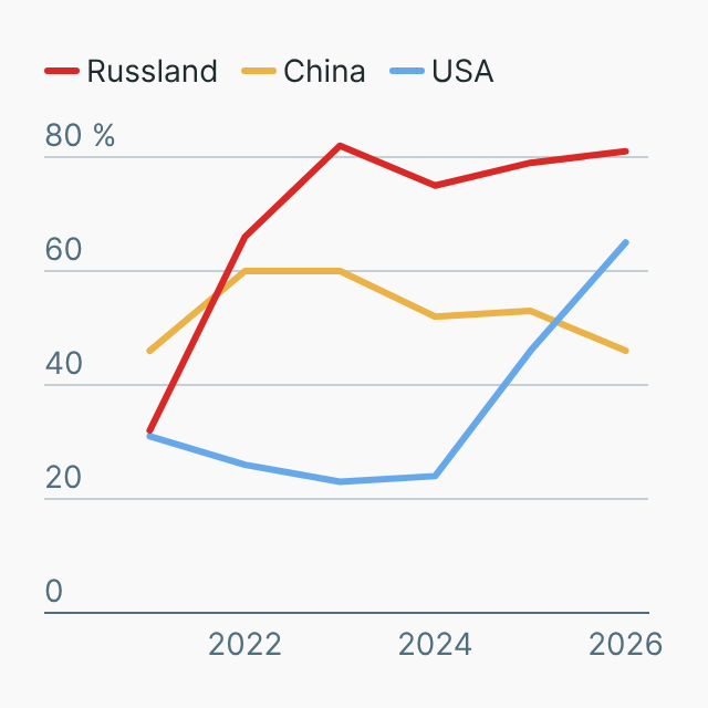 Die Grafik zeigt das Ergebnis einer Langzeitumfrage, in der Menschen in Deutschland gefragt werden, von welchem Land die größte Gefahr für den Frieden ausgeht – Entwicklung seit 2021