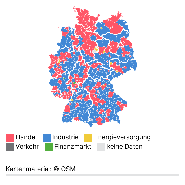 Diese Webgrafiken zeigen die Umsätze der Wirtschaftssektoren in deutschen Kreisen und kreisfreien Städten, entweder für ganz Deutschland oder in regionalen Zuschnitten.