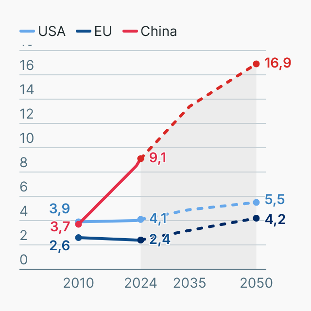 Prognose der Internationale Energiebehörde (IEA) zum Strombedarf in den USA, EU und China