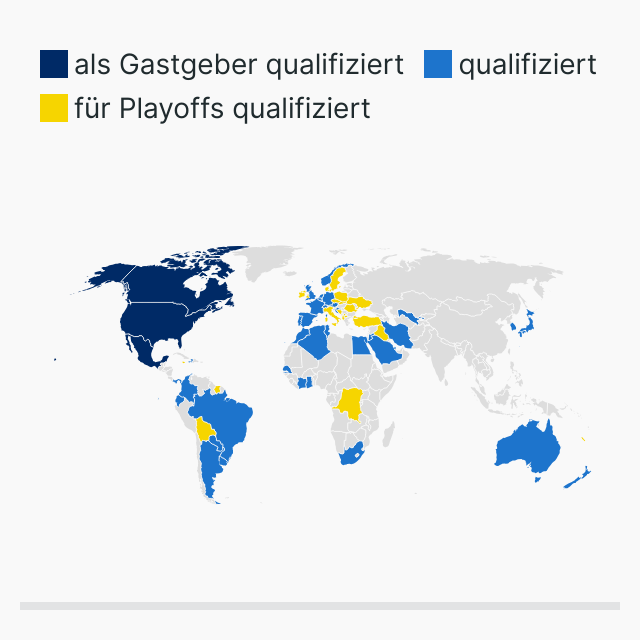 Weltkarte mit den Teilnehmern der Fußball-WM 2026: Qualifizierte Teams und Teams, die an den Playoffs teilnehmen werden.